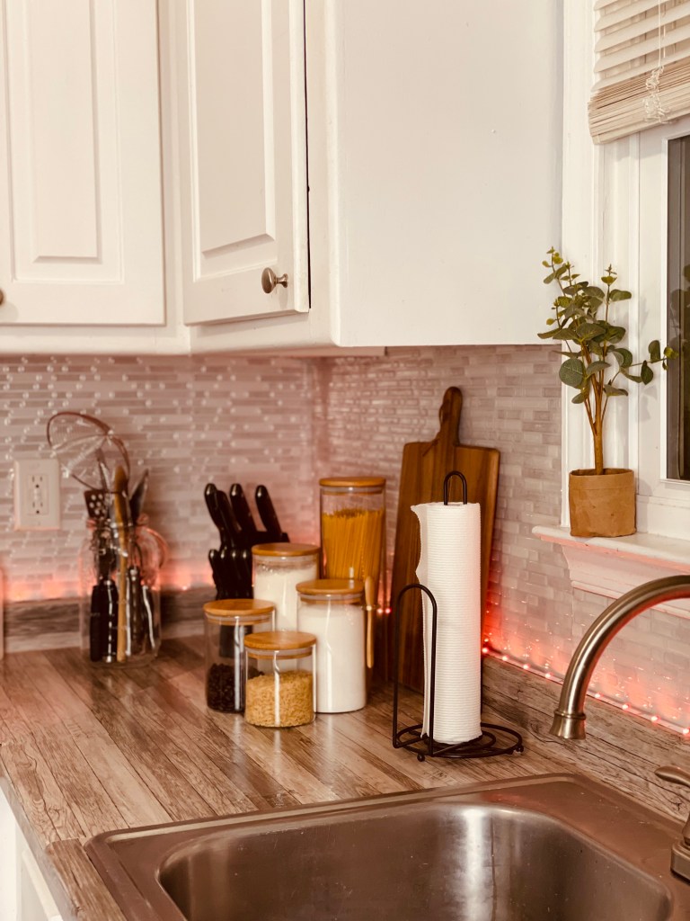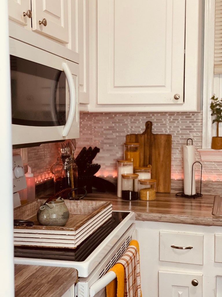 Our backsplash is completely removable as well as the peel and stick counter covering that we used. We wanted to make sure that any changes that we did make could easily be removed when we leave so that the kitchen can return to its original look. We purchased the removable backsplash from Amazon (Tic Tac Tiles), the Peel and Stick counter covering from Target (Con-Tact Creative Covering). I also purchased the glass jars I used for our pasta, coffee, flour and sugar from Amazon (Glass Jars). Click on any of the hyperlinks of these products to check them out.