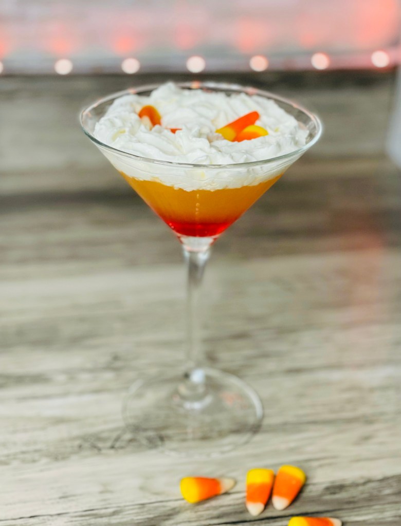 This Martini is super easy to make. You begin by adding the Vodka and Pineapple juice to a beverage shaker. Add Ice and Mix. Strain/Pour into your Martini glass. Next you will add the Sparkling Peach Juice. Add the grenadine ( it will sink to the bottom of the glass). Then top off the Martini with some whipped cream and candy corn to garnish.