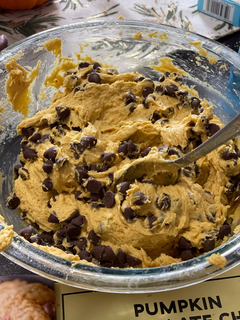 The last thing you will mix is are the Chocolate chips (yum). You will want to make sure to fold the chocolate chips into the mixture (do not use hand mixer or whisk for this step),